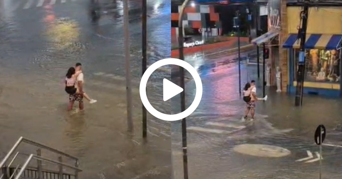 VÍDEO: Namorado ‘cavalheiro’ carrega companheira nas costas em rua alagada de Joinville