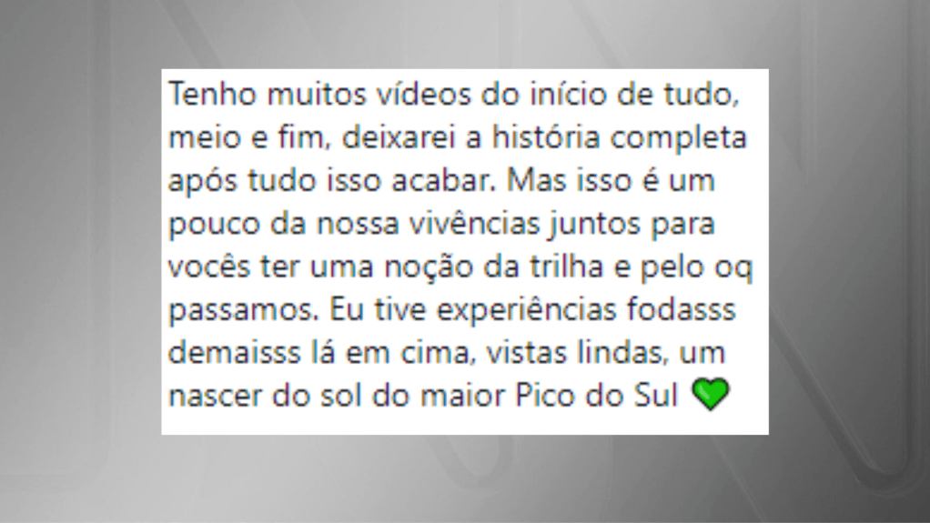 Em uma das postagens, ela afirmou que divulgará a “história completa” após o fim das buscas e descreveu a experiência como marcada por “vistas lindas” e o “nascer do sol do maior pico do Sul”.