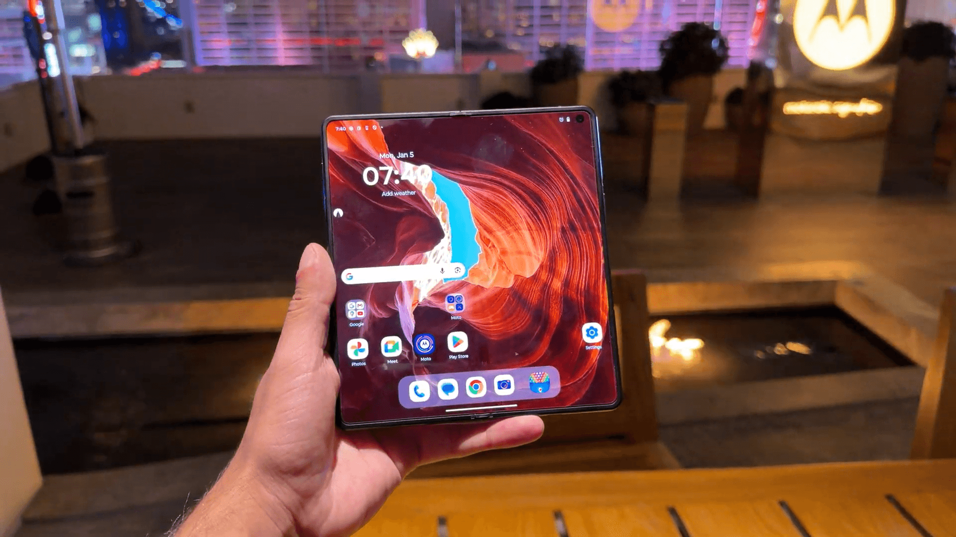 O smartphone tem um formato similar ao Galaxy Z Fold, mas é a primeira aposta da Motorola do tipo. Até então, a fabricante só havia lançado dispositivos no formato de flip, como o já consolidado Razr original.