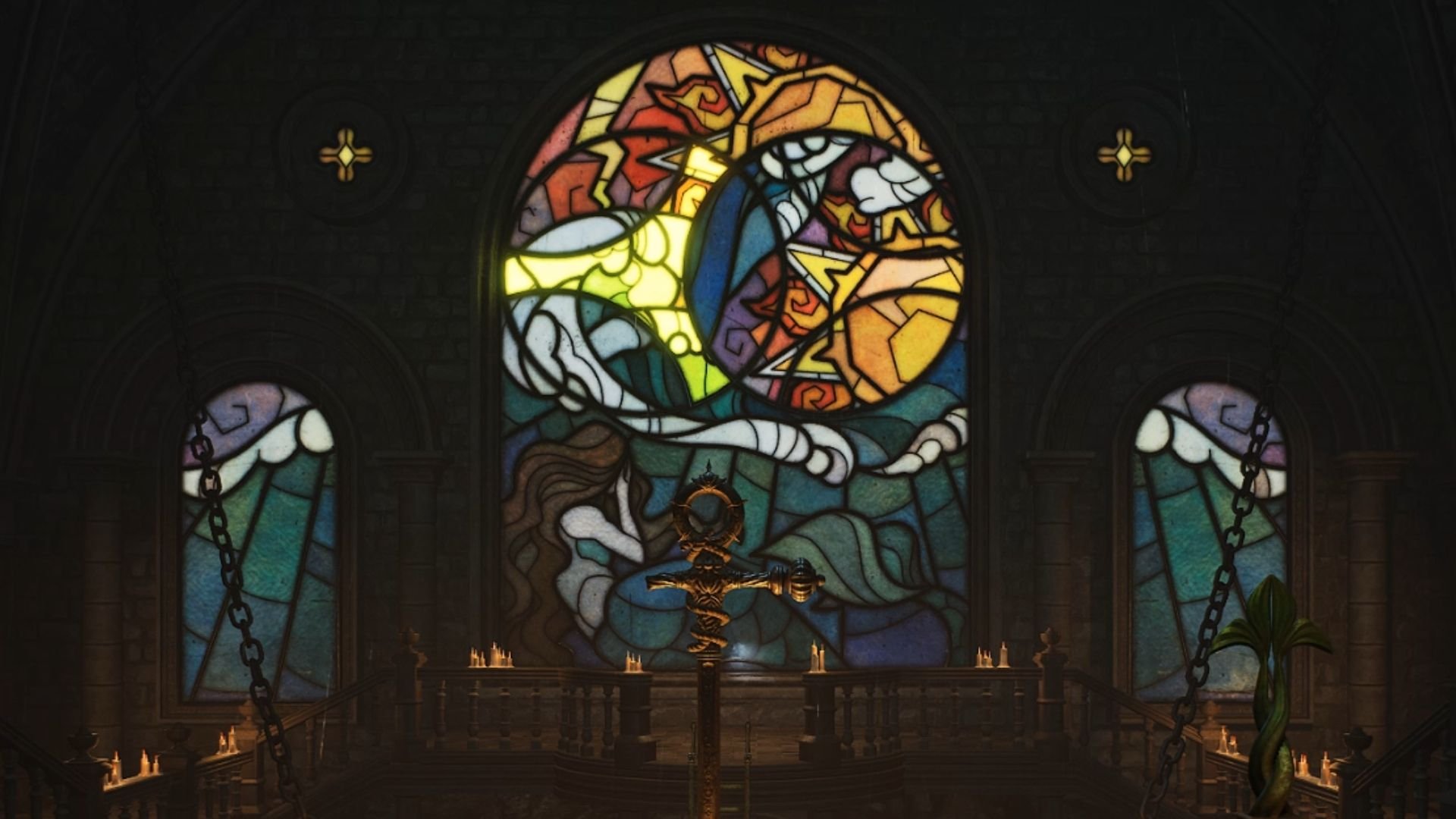 Por fim, o último puzzle do game é também um dos mais difíceis. Ele consiste em organizar um vitral, onde é preciso organizar as figuras para que fiquem da maneira correta. Entretanto, para mexer neles, é preciso girar dois círculos, que mudam de acordo com a posição sincronizada.