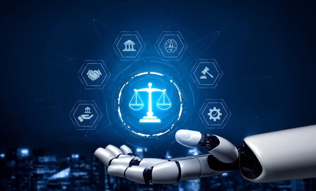 Desenho da balança da Justiça pairando acima de uma mão robótica
