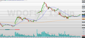 No gráfico de 60 minutos, observo que o minidólar fechou em queda e agora negocia entre as médias móveis de 9 e 21 períodos, indicando um cenário mais lateralizado no curto prazo.